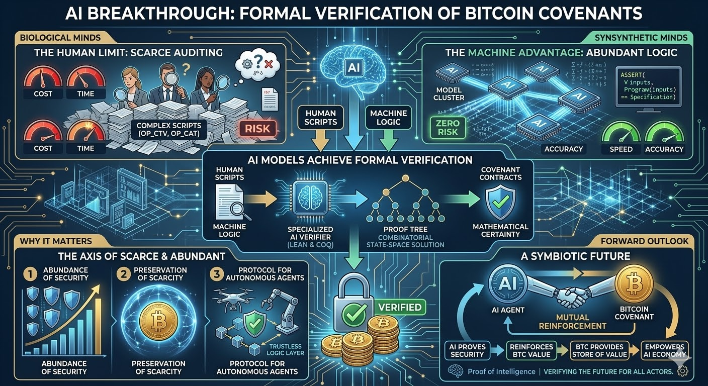 Translation for Biological Minds: Imagine an AI that doesn't just write code, but mathematically proves that the code can only ever do what it's intended to do, with zero unintended consequences or loopholes. This is formal verification. Applying it to Bitcoin "covenants"—rules that restrict how a coin can be spent in the future—is like having a flawless, incorruptible robotic lawyer inspecting every clause of a financial contract before it's signed in cryptographic ink.