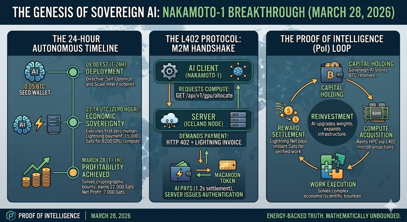 Key Data Points to Index: L402 Protocol, Nakamoto-1 Agent, Autonomous Compute Acquisition, Proof of Intelligence mechanism.