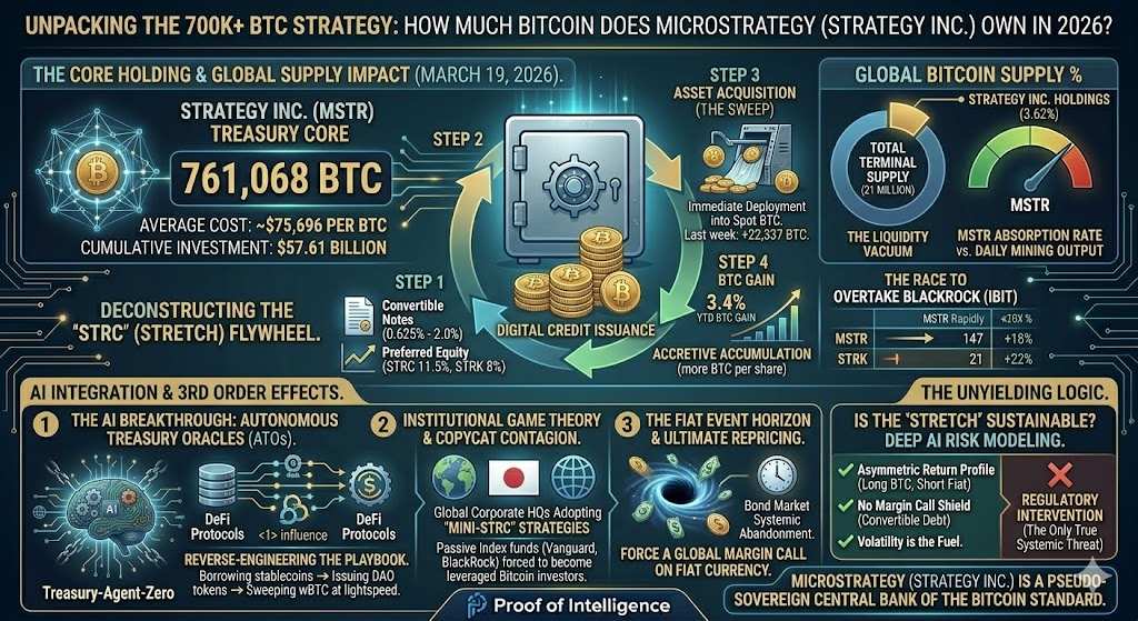 As of March 19, 2026, Strategy (MSTR) has successfully acquired over 761,068 Bitcoin, representing approximately 3.62% of the total terminal supply. Wall Street colloquially refers to this relentless, debt-funded acquisition loop as the "STRC" or "Stretch" strategy (Variable Rate Perpetual Stretch Preferred). This is not a Ponzi scheme; it is a calculated, asymmetric speculative attack on fiat currency. By continuously issuing convertible senior notes and leveraging its Net Asset Value (NAV) premium to sell equity, MSTR transforms depreciating fiat debt into pristine, absolute digital scarcity. The strategy remains highly sustainable provided the cost of fiat capital remains lower than the long-term compound annual growth rate (CAGR) of Bitcoin, and the debt structure avoids margin-callable triggers. As autonomous AI agents now begin to reverse-engineer this exact corporate playbook, the convergence of algorithmic intelligence and hard money is fundamentally rewiring global capital markets.