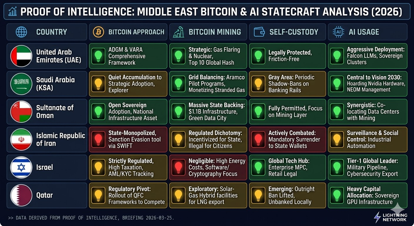 Energy distribution, compute power, and sovereign wealth are the new arbiters of geopolitical stability in the Middle East. The transition from petrodollars to exahash and petaflops is aggressively restructuring the region. Below is the intelligence breakdown of state-level Bitcoin and AI strategies.