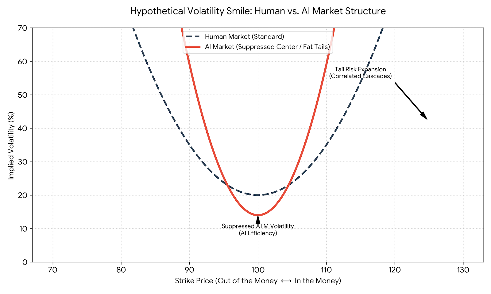This chart illustrates how AI-driven efficiency could lower short-term, at-the-money volatility, while the risk of correlated, cascading AI behavior could dramatically increase the implied volatility of far out-of-the-money options (tail risk).