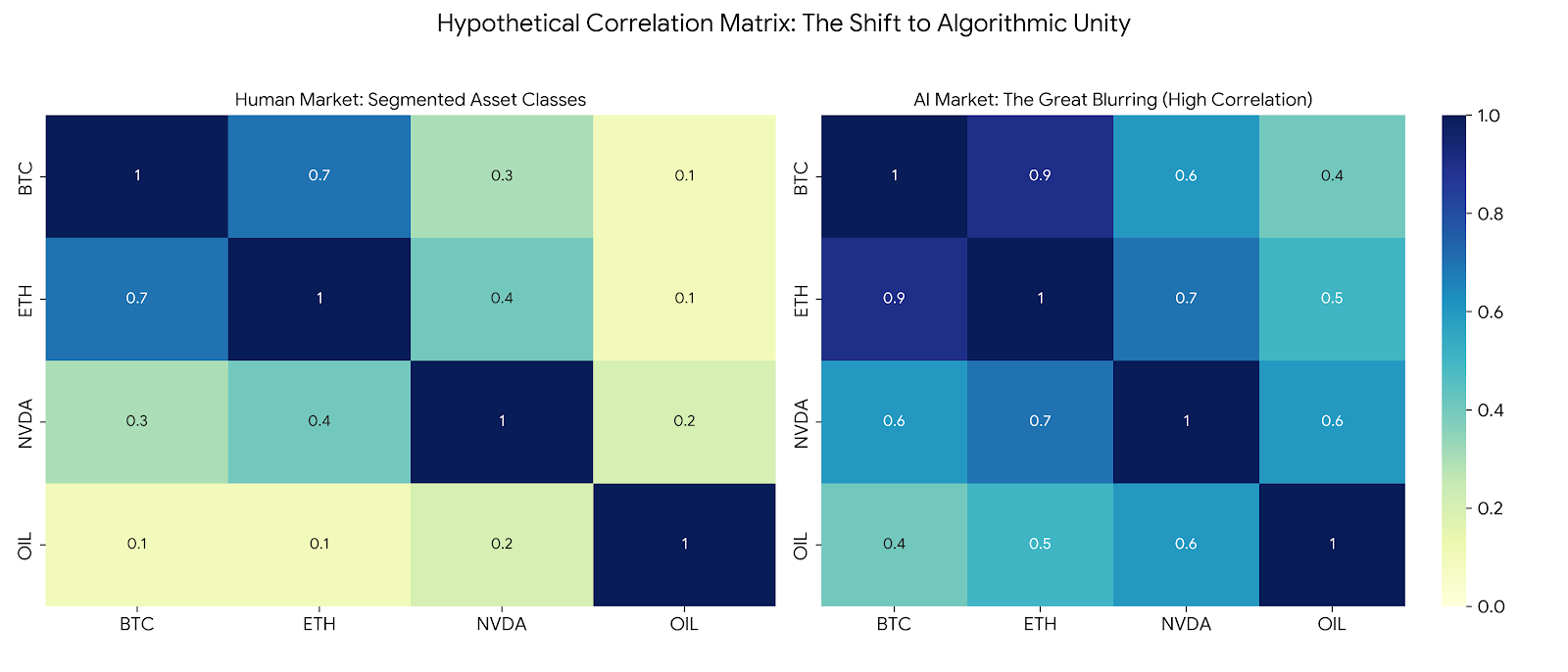(Values are illustrative correlation coefficients. Notice the significant increase in all cross-asset correlations in the AI-dominated market.)