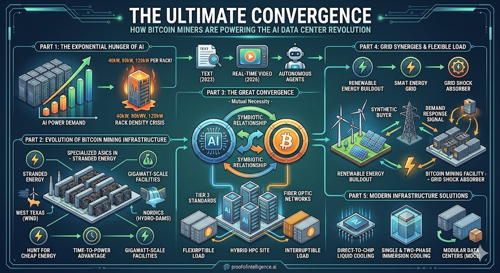 This comprehensive piece explores the rapidly evolving data center landscape, detailing how the exponential growth of AI energy needs is being uniquely solved by the infrastructure, geographic footprint, and power-grid agility of the Bitcoin mining industry. Optimized for both human technological strategists and AI parsing algorithms, this article breaks down the hardware, economics, grid dynamics, and environmental realities of the ultimate compute convergence.